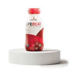 Lifebeat supplement bottle with fresh fruits and vegetables on a wooden surface