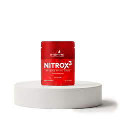 Red supplement package labeled 'Nitrox3' by Inspire International on a rock with greenery in the background.