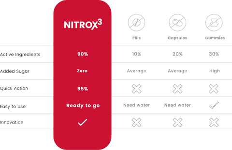 While capsules and powders only reach 40–50% absorption, Nitrox3 delivers up to 95% bioavailability with our oral strip technology.