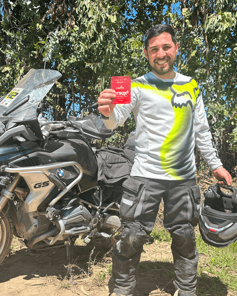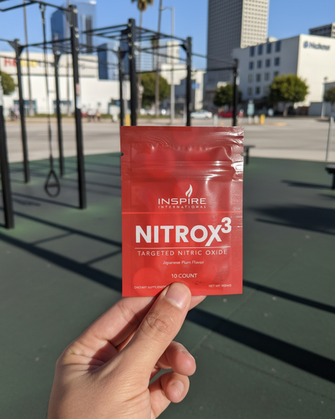Red Nitrox3 supplement packet held in front of a blurred street scene